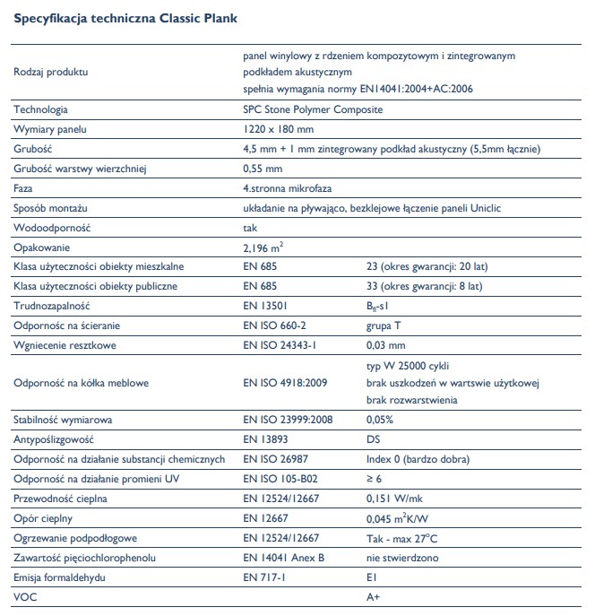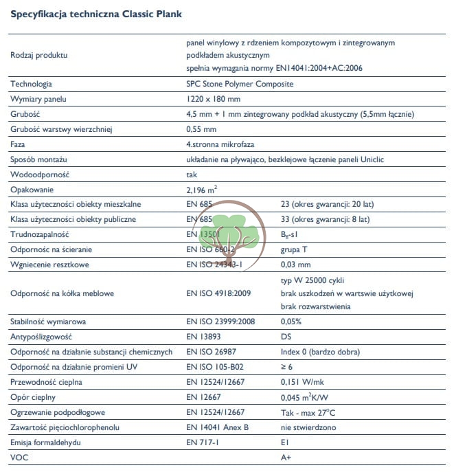 - Grubość: 4,5 mm + 1 mm zintegrowany podkład akustyczny (5,5 mm łącznie)