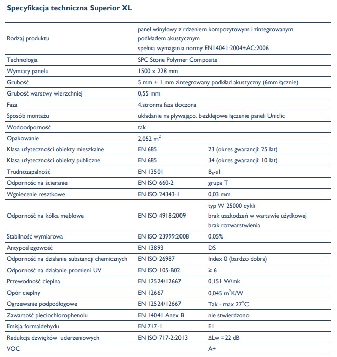 - Grubość: 5 mm + 1 mm zintegrowany podkład akustyczny (6 mm łącznie)