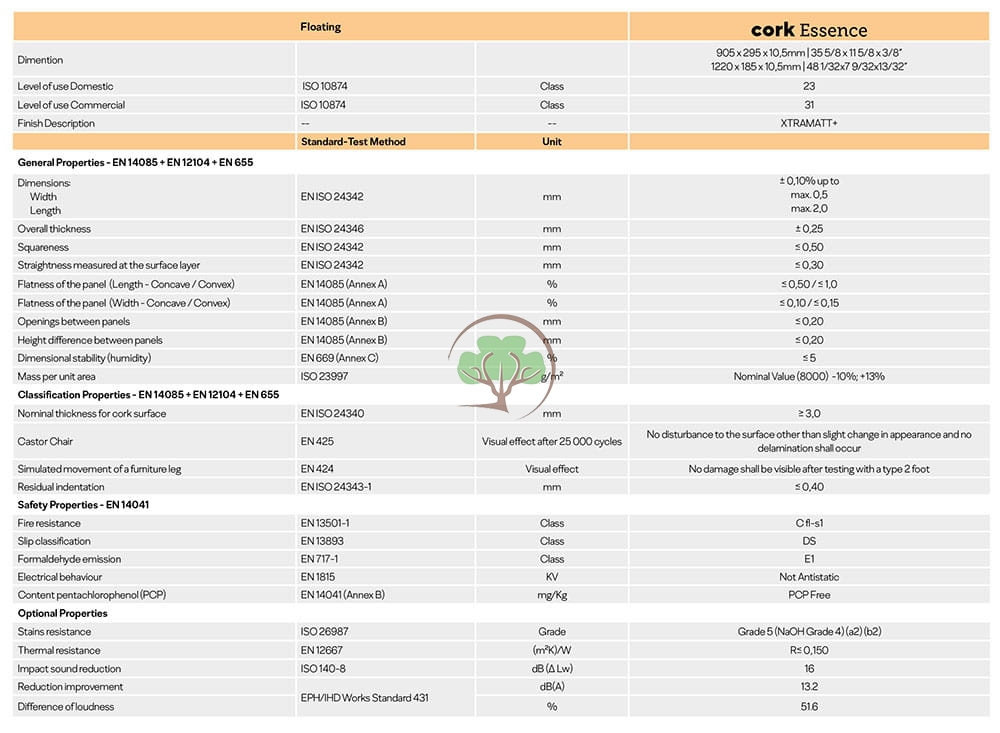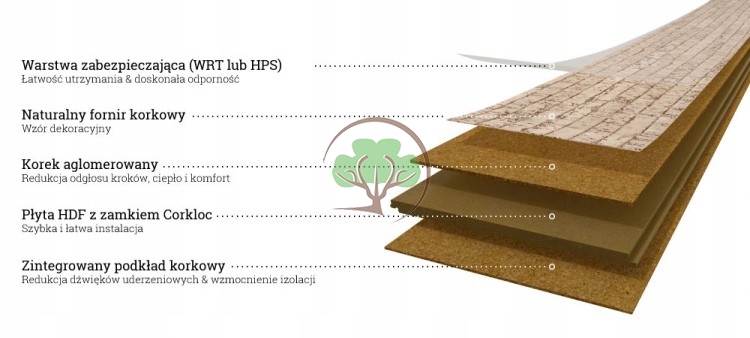 Warstwę dekoracyjną tworzy fornir korkowy, poniżej którego leży wewnętrzna warstwa sprasowanego korka. Zapewnia ona stabilność, ciepło i komfort. Pod nim znajduje się płyta HDF z bezklejowym systemem montażu CORKLOC, zapewniającym szybką i łatwą instalację. Zintegrowany korkowy podkład wytłumiający, jako spodnia część panela, wzmacnia izolację akustyczną podłogi.